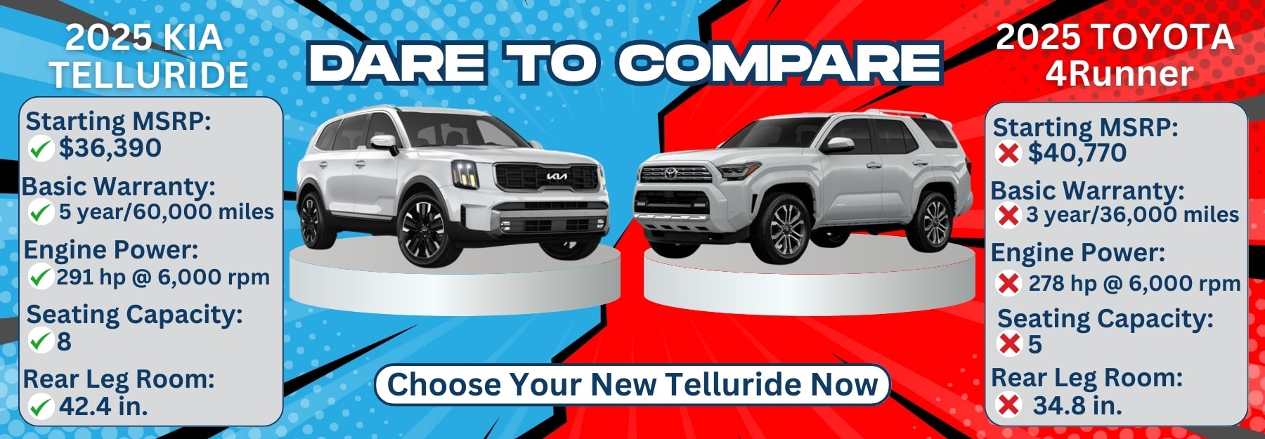 In terms of overall value and ownership benefits, the Telluride again comes out on top. Priced at $36,390, it is considerably more affordable than the 4Runner, which carries a higher price point. Although both vehicles deliver similar performance with an output of 291 horsepower at 6,000 rpm, the Telluride's robust warranty-featuring a 5-year/60,000-mile basic warranty, a 10-year/100,000-mile drivetrain warranty, and 5-year/60,000-mile roadside assistance-adds significant long-term value and peace of mind for owners. Prospective buyers should consider checking out the 2025 Kia Telluride at Jenkins Kia of Crystal River to experience firsthand its combination of affordability, advanced features, and superior practicality.