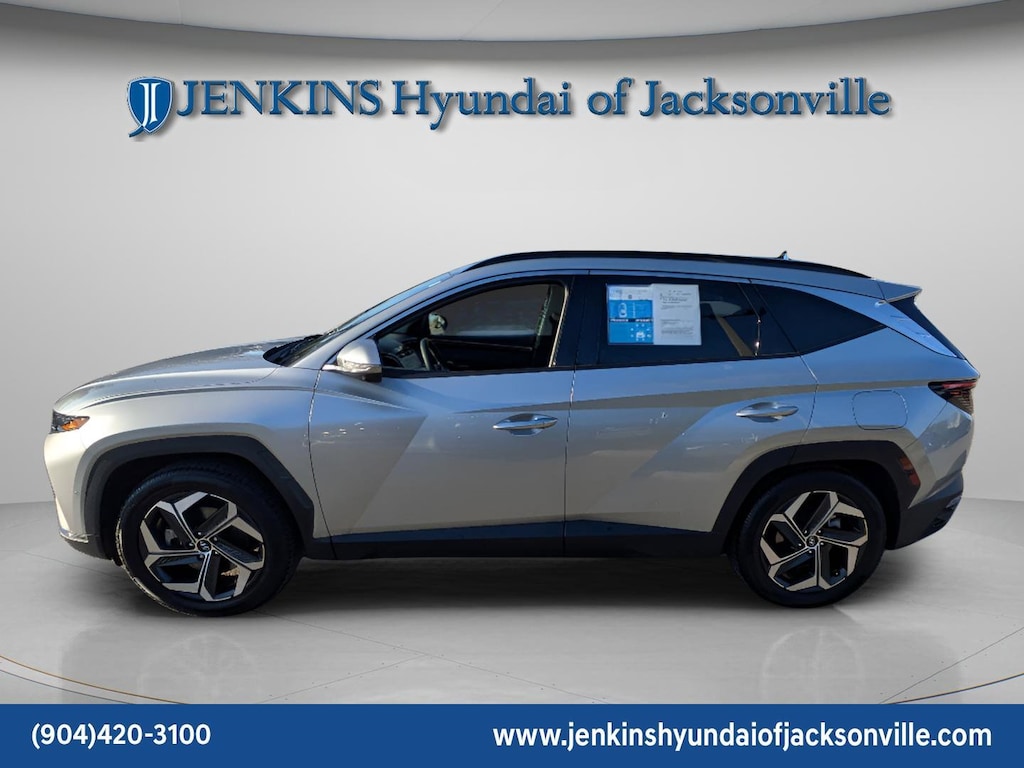 The price does not include tax, tag, license, an electronic filing fee of $449.00**, a private tag agency fee of $199.00**, and a predelivery service charge of $1199.00** **This charge represents costs and profit to the dealer for items such as inspecting, cleaning, and adjusting vehicles, as well as preparing documents related to the sale. * EPA-estimate metric: these are contingent on ideal conditions within a lab. Real-world situations such as carrying passengers or cargo, using climate control, driving style, and ambient temperatures can affect actual metrics. 25/32 City/Highway MPG CARFAX One-Owner. This 2024 Hyundai Tucson Limited in Shimmering Silver features Option Group 01, 3.648 Axle Ratio, 4-Wheel Disc Brakes, 8 Speakers, ABS brakes, Air Conditioning, Alloy wheels, AM/FM radio: SiriusXM, Apple CarPlay & Android Auto, Auto High-beam Headlights, Auto-dimming Rear-View mirror, Automatic temperature control, Brake assist, Bumpers: body-color, Delay-off headlights, Driver door bin, Driver vanity mirror, Dual front impact airbags, Dual front side impact airbags, Electronic Stability Control, Emergency communication system: Blue Link Connected Car Service (3-year complimentary subscription), Exterior Parking Camera Rear, Four wheel independent suspension, Front anti-roll bar, Front Bucket Seats, Front Center Armrest, Front dual zone A/C, Front reading lights, Fully automatic headlights, Garage door transmitter: HomeLink, Heated & Ventilated Front Bucket Seats, Heated door mirrors, Heated front seats, Heated rear seats, Heated steering wheel, Illuminated entry, Leather Seat Trim, Low tire pressure warning, Memory seat, Navigation System, Occupant sensing airbag, Outside temperature display, Overhead airbag, Overhead console, Panic alarm, Passenger door bin, Passenger vanity mirror, Power door mirrors, Power driver seat, Power Liftgate, Power moonroof, Power passenger seat, Power steering, Power windows, Radio data system, Radio: Bose Premium w/AM/FM/HD Audio System, Rain sensing wipers, Rear anti-roll bar, Rear reading lights, Rear seat center armrest, Rear side impact airbag, Rear window defroster, Rear window wiper, Remote keyless entry, Roof rack: rails only, Security system, Speed control, Split folding rear seat, Spoiler, Steering wheel mounted audio controls, Tachometer, Telescoping steering wheel, Tilt steering wheel, Traction control, Trip computer, Turn signal indicator mirrors, Variably intermittent wipers, Ventilated front seats, and Wheels: 19" x 7.5J" Machine-Face Finish Alloy . Visit our showroom 24/7 at Jenkinshyundaiofjacksonville or call 904-420-3100. FWD