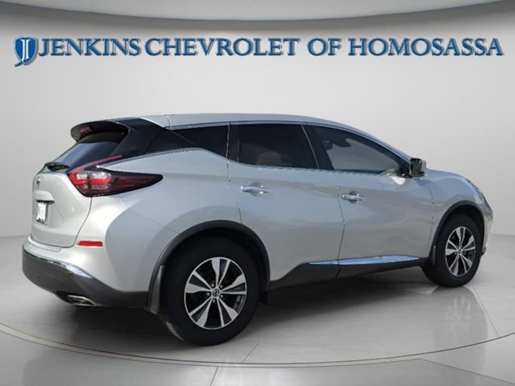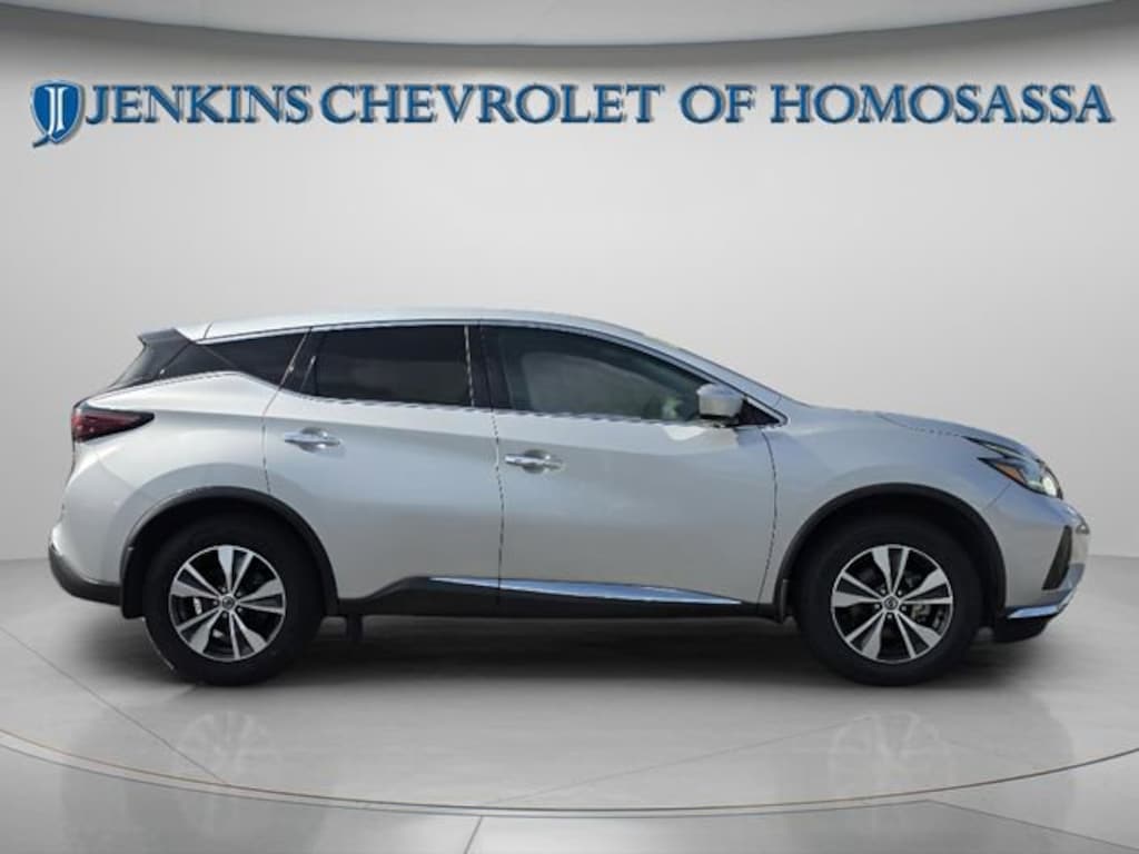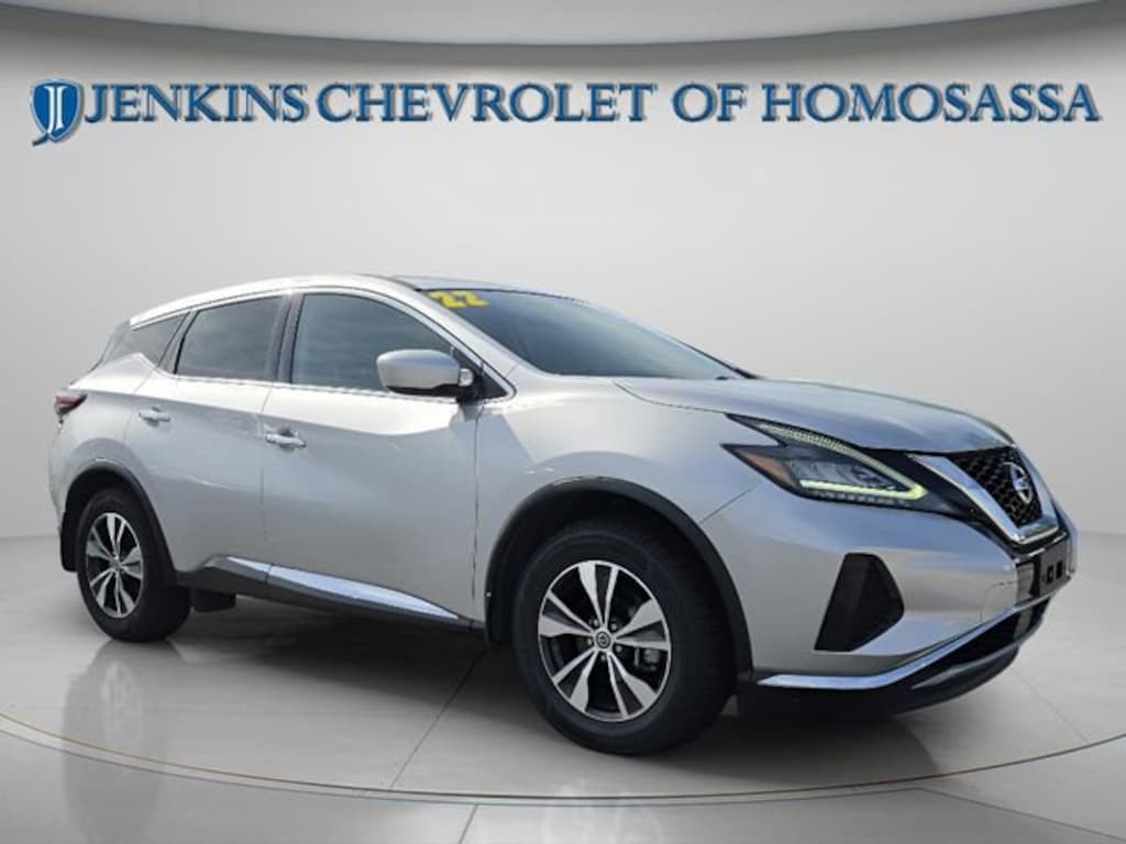 This vehicle comes equipped with CVT with Xtronic, 4-Wheel Disc Brakes, 4.667 Axle Ratio, 6 Speakers, ABS brakes, Air Conditioning, Alloy wheels, AM/FM radio: SiriusXM, AM/FM/CD/MP3/WMA Audio System, Auto High-beam Headlights, Automatic temperature control, Blind Spot Warning, Brake assist, Bumpers: body-color, Carpeted Floor Mats & Carpeted Cargo Mat, CD player, Child-Seat-Sensing Airbag, Cloth Seat Trim, Delay-off headlights, Driver door bin, Driver vanity mirror, Dual front impact airbags, Dual front side impact airbags, Electronic Stability Control, Four wheel independent suspension, Front anti-roll bar, Front Bucket Seats, Front Center Armrest, Front dual zone A/C, Front reading lights, Fully automatic headlights, Illuminated entry, Knee airbag, Low tire pressure warning, NissanConnect featuring Apple CarPlay and Android Auto, Occupant sensing airbag, Outside temperature display, Overhead airbag, Overhead console, Panic alarm, Passenger door bin, Passenger vanity mirror, Power door mirrors, Power steering, Power windows, Radio data system, Rear anti-roll bar, Rear Bumper Protector, Rear Parking Sensors, Rear reading lights, Rear seat center armrest, Rear side impact airbag, Rear window defroster, Rear window wiper, Remote keyless entry, Security system, Speed control, Speed-sensing steering, Splash Guards (B92), Split folding rear seat, Spoiler, Steering wheel mounted audio controls, Tachometer, Telescoping steering wheel, Tilt steering wheel, Traction control, Trip computer, Variably intermittent wipers, and Wheels: 18 Machined Aluminum-Alloy . Jenkins Chevrolet of Homosassa proudly serving Homosassa, Spring Hill, Hernando, Crystal River, Beverly Hills, Inverness. Just a half hour North of Buccaneer Bay. Come see the large, expansive inventory of the Jenkins Auto Group. 20/28 City/Highway MPG CVT with Xtronic. Clean CARFAX. Brilliant Silver Metallic 2022 Nissan Murano S FWD CVT with Xtronic 3.5L V6 DOHC 24V